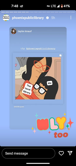 So the Teen Book Box was ready on Wednesday, April 17, 2024. I thought that it would be ready by Monday of next week, but they work fast! Maybe not many Glendale teens are requesting them? Ale surprised me with the news! I was really surprised and excited! She said that she got the email while she was waiting for her Starbucks and drove to the library on her way back from ASU West. She didn't tell me until she got home. I took pictures of everything that came in the Teen Book Box. I was expecting a literal box, but it actually came in a blue tote bag that Ale can now use for her Glendale library book bag if she so chooses.